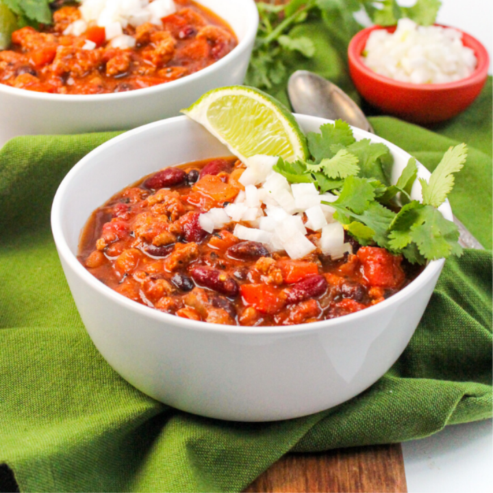 This crockpot turkey chili recipe is the perfect healthy comfort meal for a busy weeknight. Plus, it’s versatile! Either prep it in the morning and throw it in the slow cooker so it’s ready by dinnertime, prep it and simply freeze it for later, or cook it right then and there either on the stove top or in the Instant Pot! I’ll share more details on all the variations below.