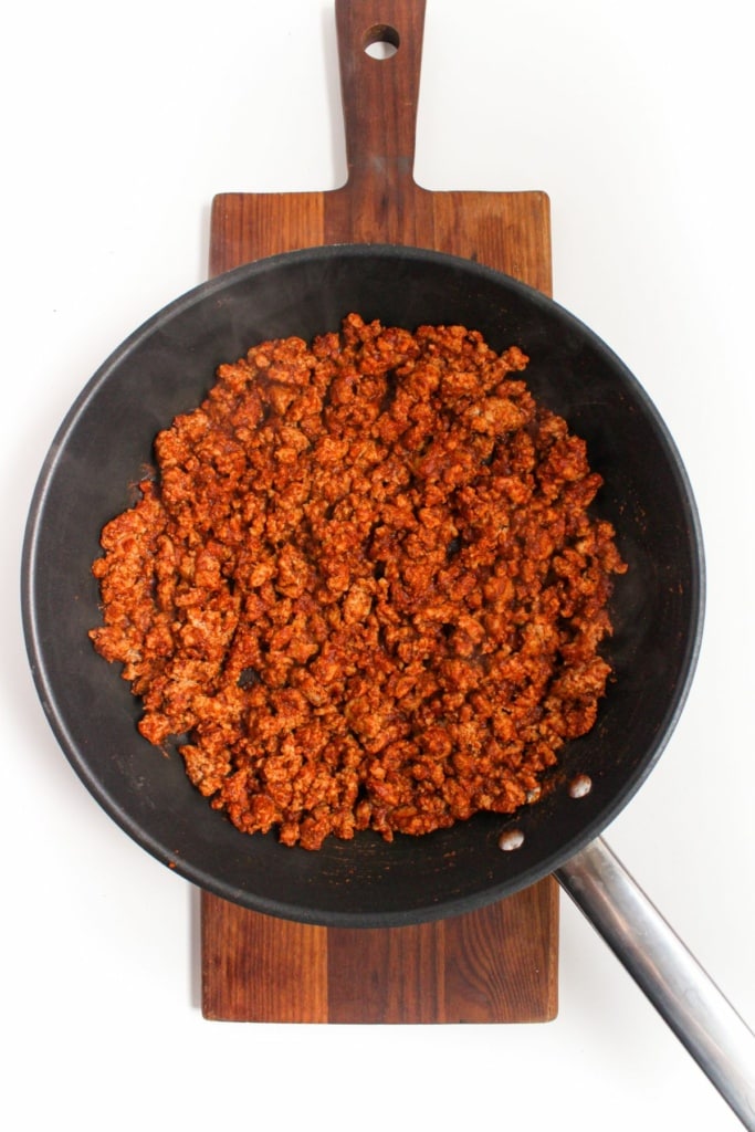 Heat a large nonstick skillet over medium-high heat. Add the ground turkey and cook, stirring frequently to break up, until turkey is mostly cooked through. Then, add the spices and tomato paste and cook for 1-2 minutes, or until any liquid has evaporated and the spices are fragrant.