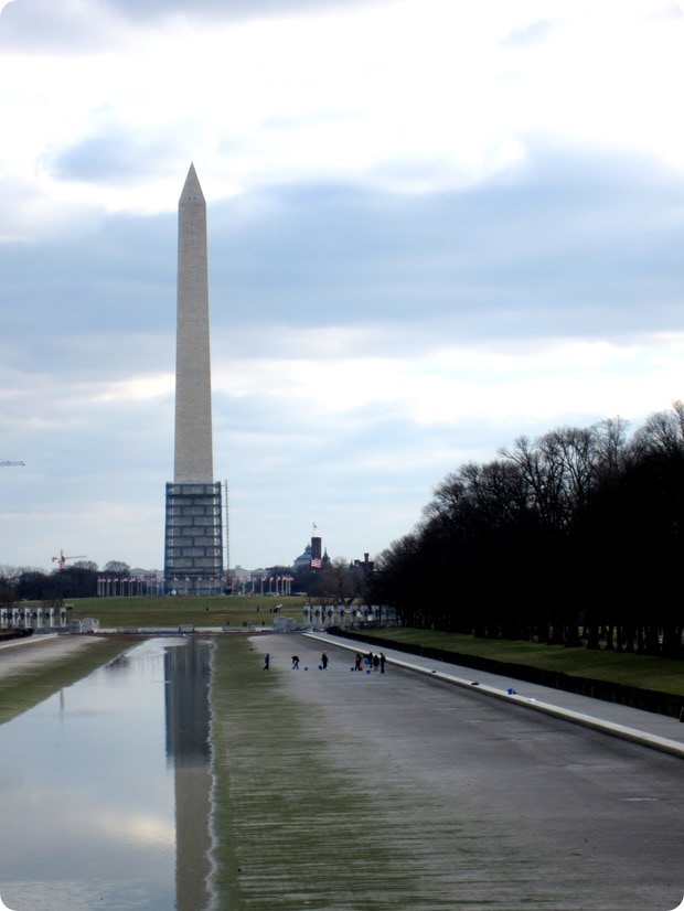 I found Sarah, and the two of us set off together down the reflecting pool, which was partially frozen! (The people out on it were doing some sort of official cleaning.)