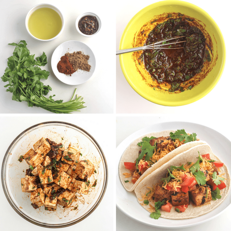 Fill corn tortillas with the tofu, diced tomatoes, cheese, cabbage, cilantro – whatever your favorite taco toppings are!