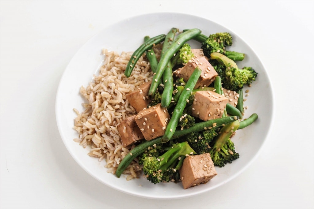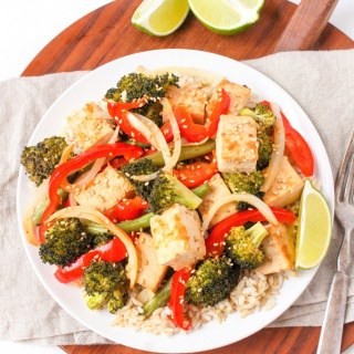 Add any veggies you have on hand to the pan and cook until tender, then add the tofu back in and pour in the remaining marinade. Cook until most of the liquid is evaporated and serve over brown rice!