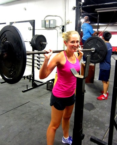 Remember when I first started doing CrossFit last summer and I couldn’t do a back squat because of shoulder mobility problems? Well, I’m really excited to share that I have worked my way up to doing them now! I’m still not doing a ton of weight so I can focus on form and my shoulders still feel really tight just holding the bar, but I’m proud of myself for making it this far. Yoga, stretching, and just getting better at CrossFit in general all helped. On Monday night, our strength WOD was to do 4 rounds of back squats, 4 reps at a time. I made it up to 65 pounds. Yay!