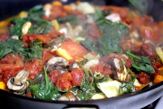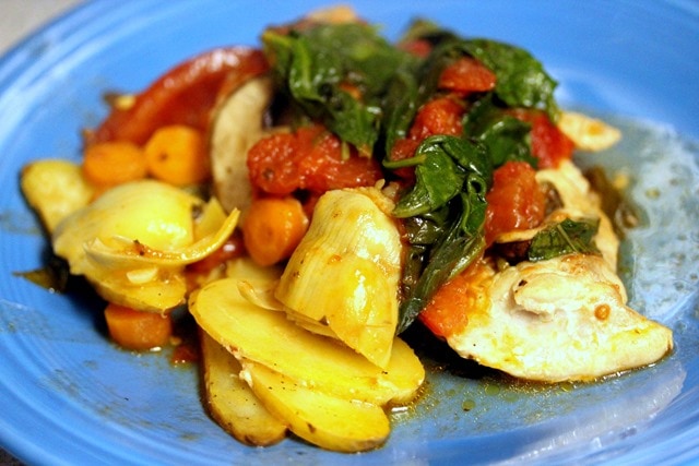 Aaaanyway! When Matt and I finished up with CrossFit, we came home and threw together a simple dinner. It was already almost 9 p.m. and we were HUNGRY – perfect night for one of our “throw everything in a pot” type meals. This was essentially my Saucy Tomato & Artichoke Chicken (click for recipe), plus some random stuff that was hanging out in the fridge – mushrooms, carrots, and fingerling potatoes.