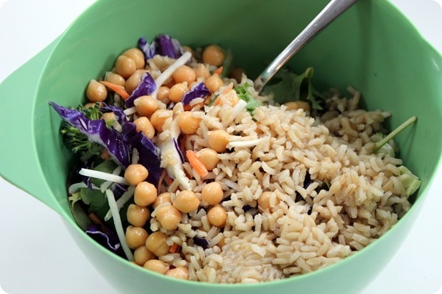 On the food front, yesterday for lunch I made one of my standard favorite massive salads. Lots of greens and veggies, plus some canned chickpeas, 90 second microwave brown rice, avocado, and homemade balsamic vinaigrette. Delish!