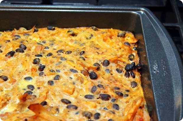 For dinner last night, I made the world’s most random casserole. I was planning to make Mexican Lasagna (<—recipe) since it’s on the Winter Shape Up meal plan, but I totally forgot to get more tortillas, so I got creative. I was inspired by my Mexican Brown Rice Casserole from a million years ago, and did a sort of variation on that!