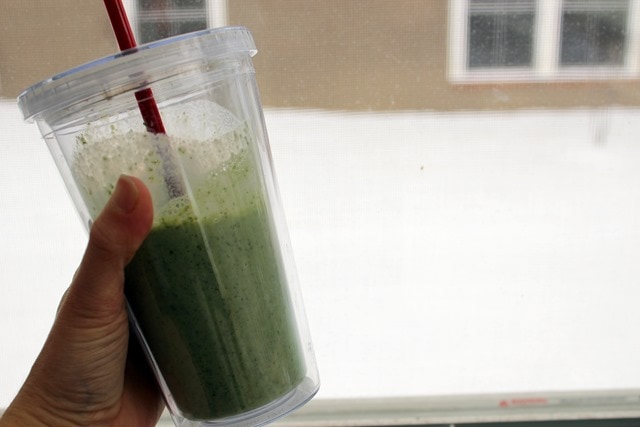 As for breakfast this morning, I’m back on the green smoothie train after being reminded how much I love them while at Canyon Ranch! Matt was working from home until about 10, so I made us a both smoothies with kale + vanilla almond milk + plain Greek yogurt + chia seeds + banana. Yum!