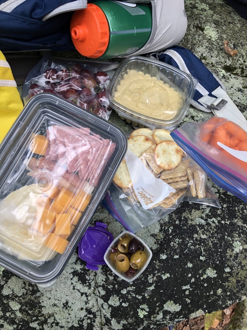 We stopped for lunch about an hour and a half in and enjoyed a picnic lunch we ordered from our bed and breakfast. Delicious! Homemade hummus, grapes, carrots, crackers, cheese, meats, and olives. I love lunches like this with lots of different parts, textures, and tastes!