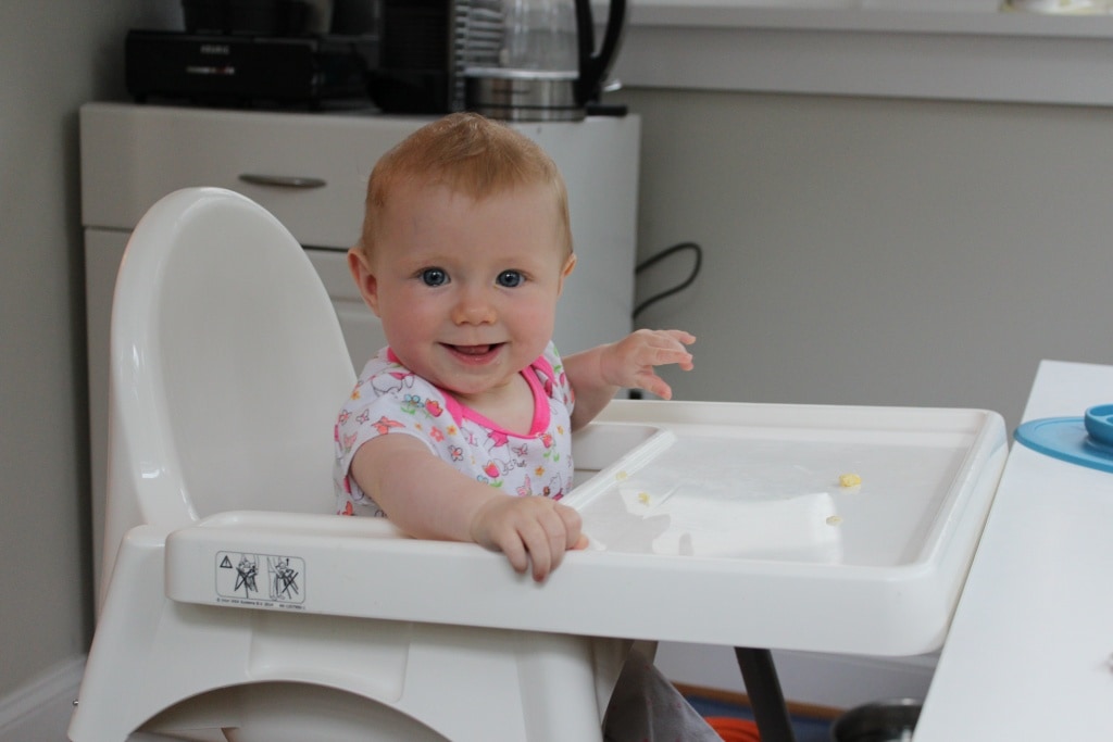 As you see in this photo we don’t have her strapped into the high chair. Since she’s not able to move around a ton/try to push herself out of the chair yet, I’ve read it can sometimes be best to leave them unstrapped. This is especially true in the early phases of baby led weaning, JUST in case they start to choke and you need to rapidly remove them from the chair.