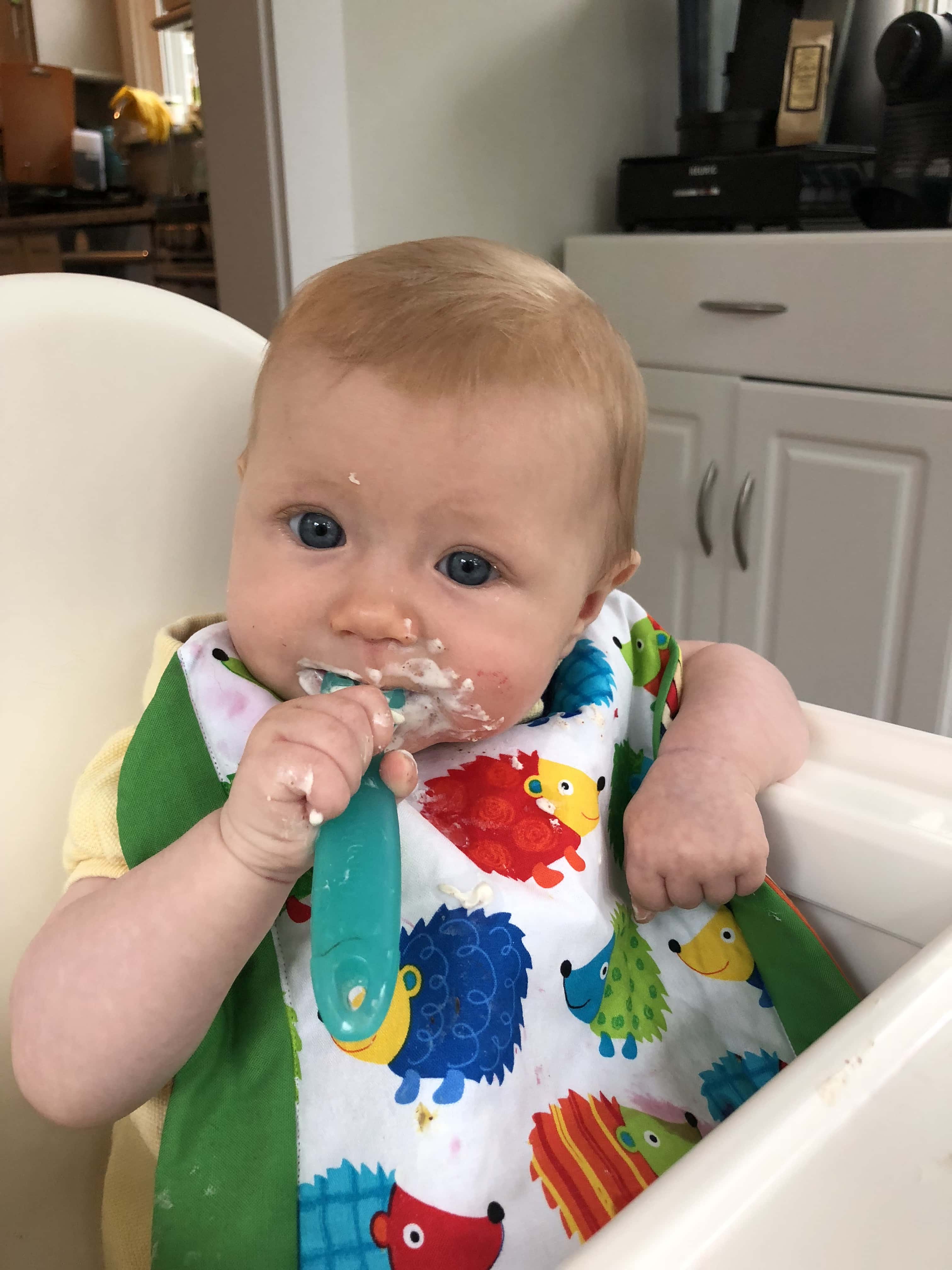 I mixed a couple spoonfuls of plain Greek yogurt with about a teaspoon of peanut butter and we let her feed it to herself with her spoon. (You can also just thin the peanut butter with breastmilk or formula if you’d rather.)