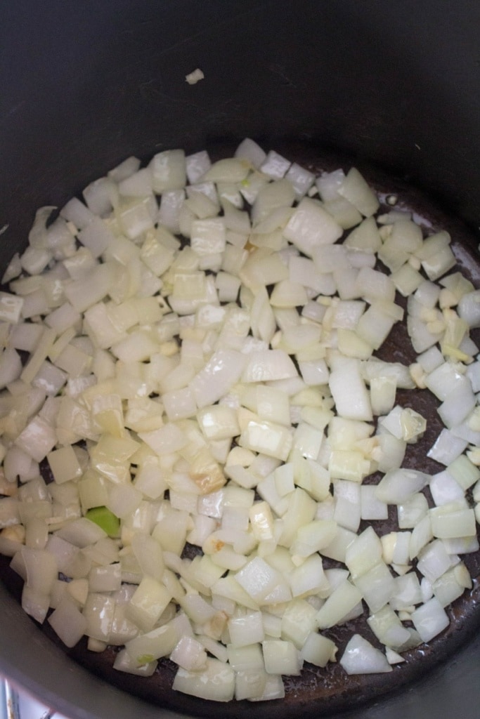 - In a large pot over medium high heat, add the olive oil, onion, and garlic. Cook and stir for 3 minutes, then add in the ground turkey and stir until the turkey is fulled cooked (no longer pink).