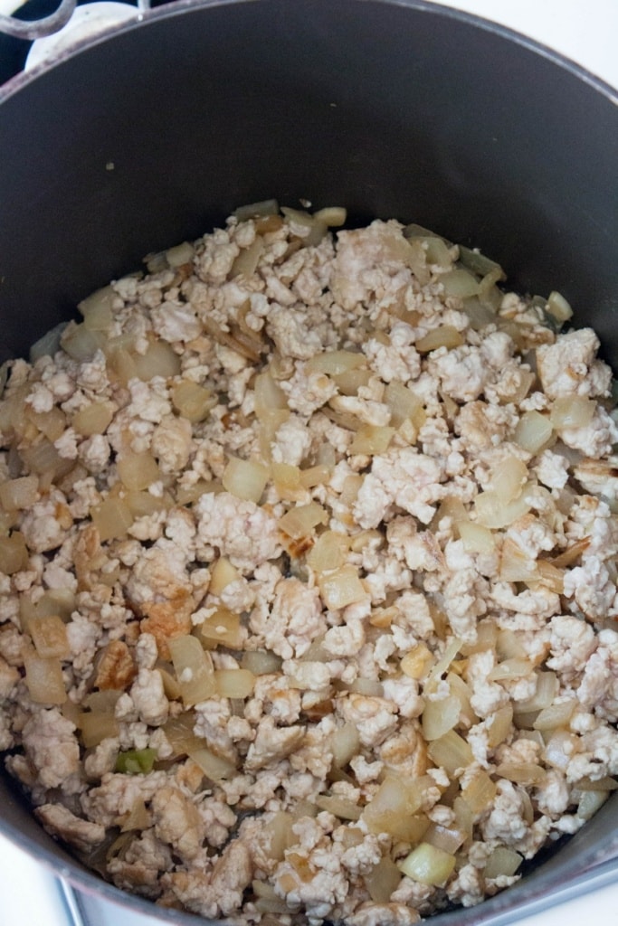 I started by sautéing some ground turkey in a little olive oil with garlic and onions over medium-high heat. After a few minutes, I added the ground turkey and stirred until the turkey was fully cooked (no longer pink).