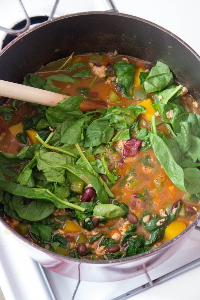 After the stew simmered for awhile, it was still a little too soup-y. So I got creative and added in a package of 90 second brown rice. (I cooked it first, then threw it in). Here’s where I added the spinach, too.