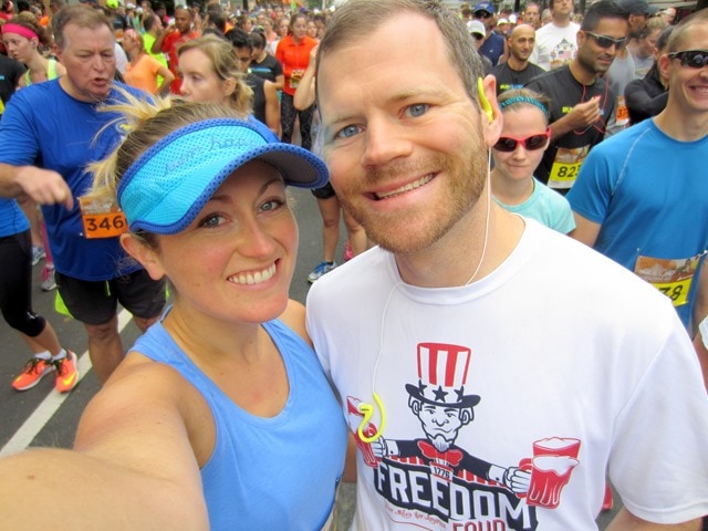 The 10k race starts at 9 a.m. (the 5k is at 8 a.m. – I triple checked the time this year, ha!), which I love because we were able to roll out of bed at a reasonable hour to head over. We had no problem finding free street parking, getting our bibs, hitting the portapotties, and doing a quick warm up jog/stretch before lining up in the starting area.