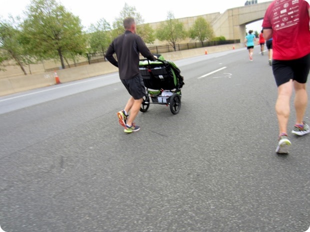 You double back the same way, so I had fun cheering for the really fast people once they started heading back past us. I was also totally impressed by this guy with a double wide stroller (and two toddler-aged kids sitting in it) who breezed past me doing like a 7:30 minute/mile looking like he was out for a casual jog. Beast!