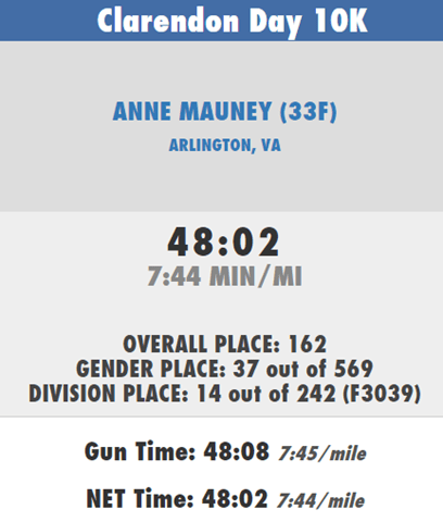 On Saturday, Matt and I ran the Clarendon Day 10k, and I set myself a new 10k race PR (personal record)!! This was my third time doing the 10k (fourth time doing the race series – remember last year when my friend and I ran the 5k by accident?) and I always enjoy it. It’s convenient, not too big, and well organized.