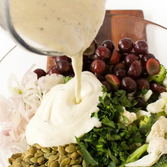 This Greek yogurt dressing is especially delicious in my crunchy broccoli cauliflower salad, but can also be used in tons of other ways! Toss it with your favorite greens, use it as a dip for crunchy veggies and crackers, or drizzle it over your favorite vegetable side dish.
