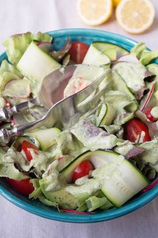 The secret ingredient that gives this dressing some nice creaminess: pureed cauliflower. So while it’s creamy, it’s not too thick or heavy. The lemon gives it a nice bit of tang and acidity, and the combination of herbs lends brightness, a more intense flavor, and a pretty color, too. I really love dried dill in particular – anyone else?