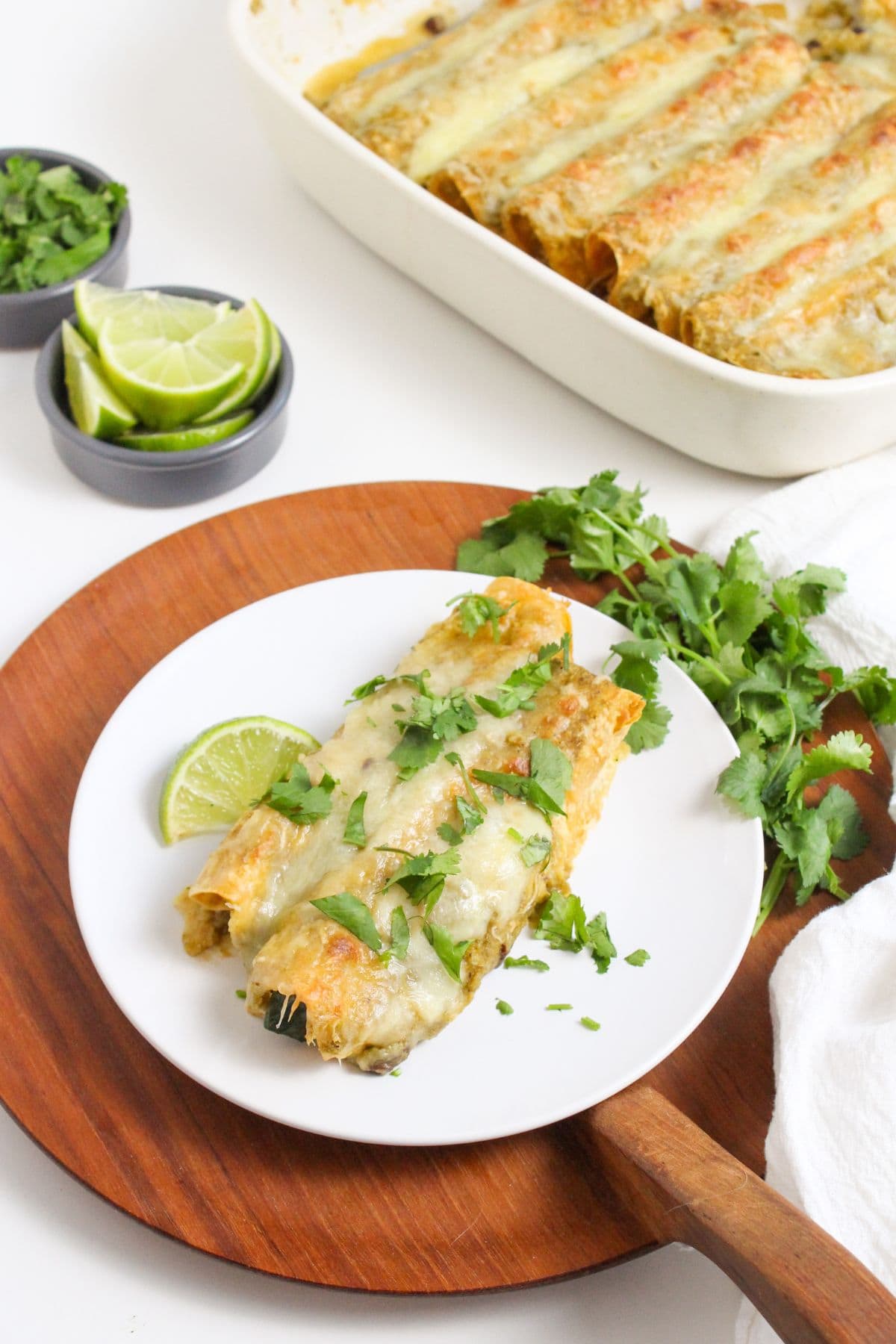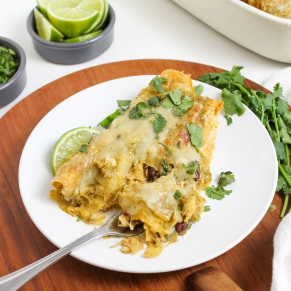 Looking for more enchilada recipes? Try these healthy chicken enchiladas (with red sauce) or these vegetarian mushroom enchiladas.