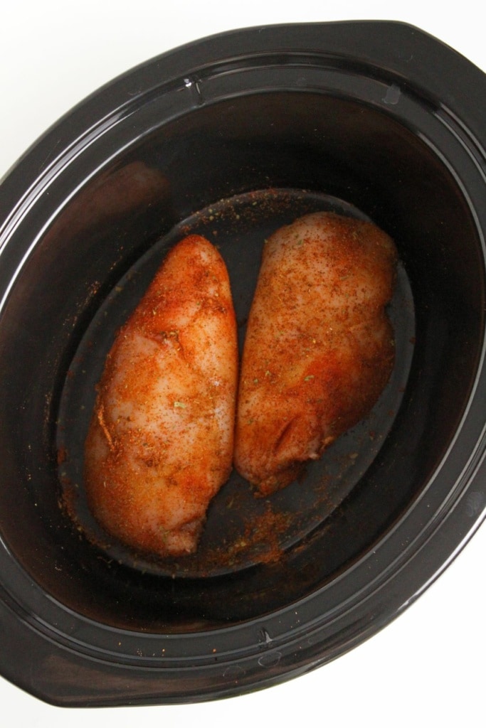 - Place the chicken breasts in the bottom of a slow cooker insert and add the cumin, smoked paprika, chili powder, and oregano. Toss the chicken around to coat in the seasonings.