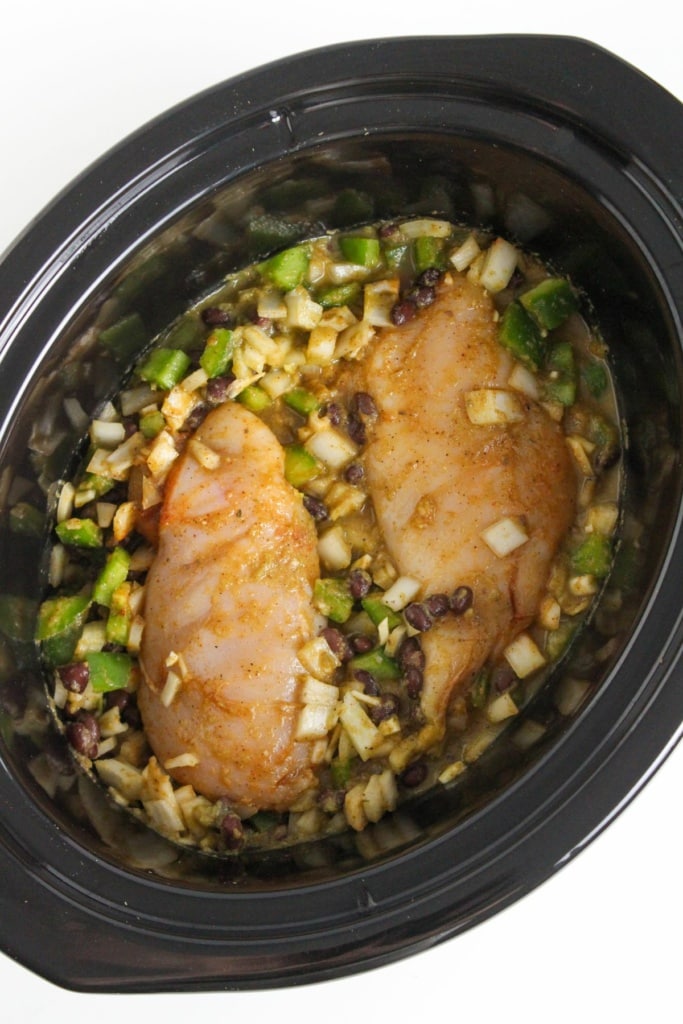 - Add the onion, bell pepper, black beans, and 12 oz of the enchilada sauce, reserving the remaining 4 oz of sauce. Mix the veggies and sauce together and nestle the chicken into the mixture.