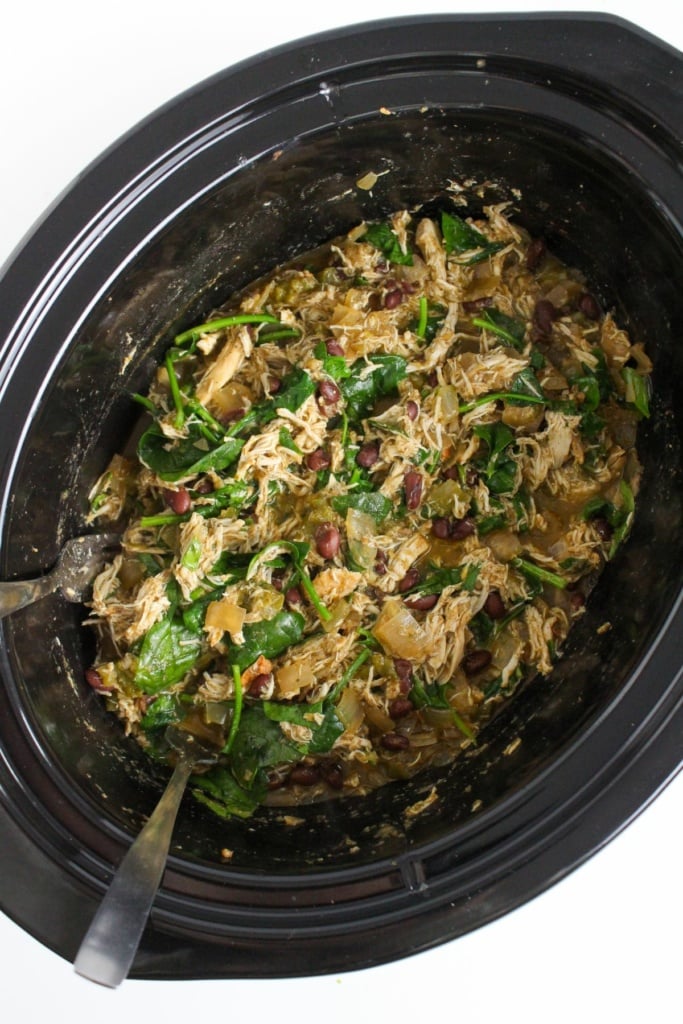 Then, use two forks to shred the chicken. Stir to mix everything together. Add spinach to the hot mixture and stir until it’s wilted.