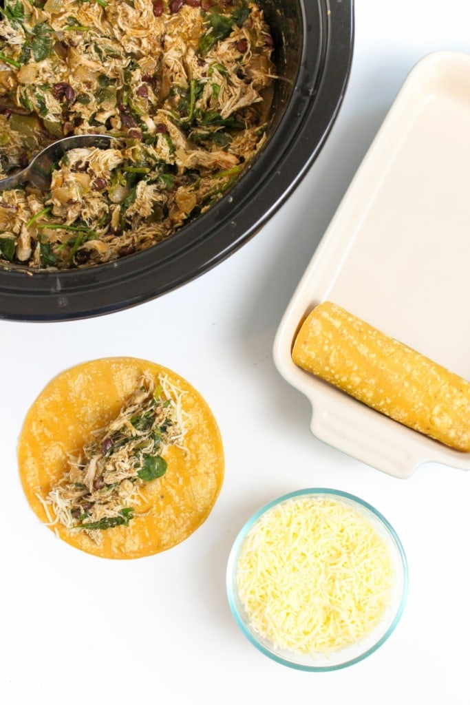- To assemble the enchiladas: wrap tortillas in a paper towel and microwave for 30-45 seconds, until pliable. Sprinkle about 1 tablespoon of shredded cheese in a line down the center of a tortilla. Use a slotted spoon to remove about 1/4 cup of filling from the slow cooker, leaving any extra liquid behind. Place the filling on top of the cheese, roll the tortilla around the filling, and place seam-side down in a 13x9" baking dish. Repeat until all of the filling is used; you should have some sauce left in the bottom of the slow cooker and some shredded cheese left after filling the enchiladas.