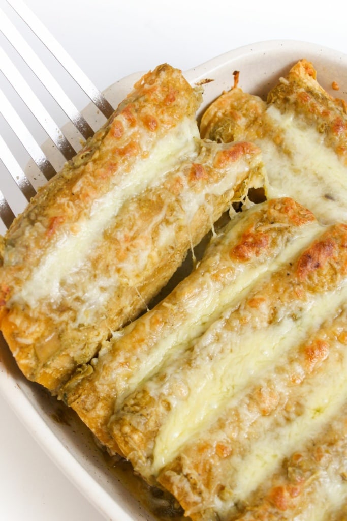 I love that with this recipe, most of the cooking is done in the slow cooker. Then, you just roll the filling into the tortillas, top with shredded cheese and your favorite green enchilada sauce, and broil until melty.