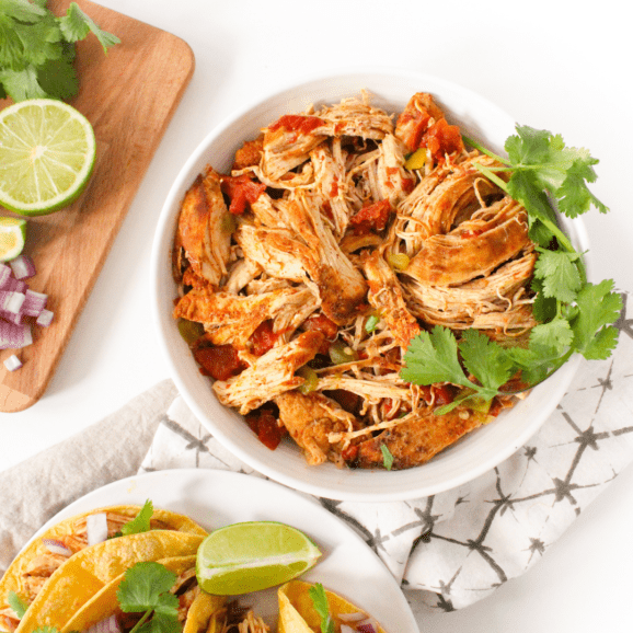 I really love this shredded chicken – it’s super juicy, a little spicy, and so easy. Use it in tacos, quesadillas, and burrito bowls; it really is perfect!