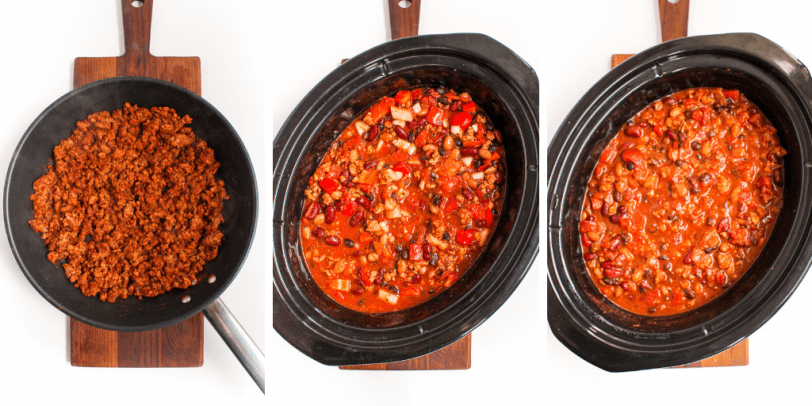 Now it’s time for the crockpot/slow cooker! Place the turkey mixture into the insert of a slow cooker and add the diced onion and red pepper, canned tomatoes, and beans (pinto beans, red kidney beans, and black beans – or a mix of whatever you prefer!).