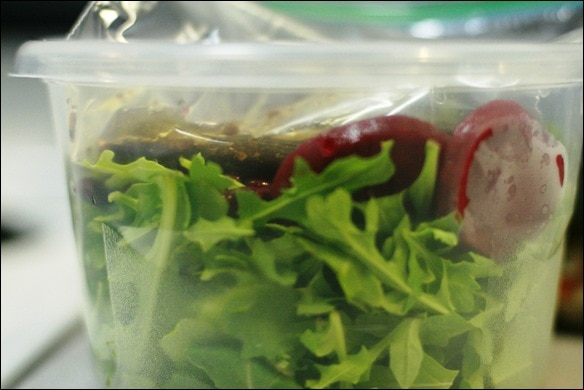 With a little baggie of balsamic vinaigrette dressing inside the lid of the container: