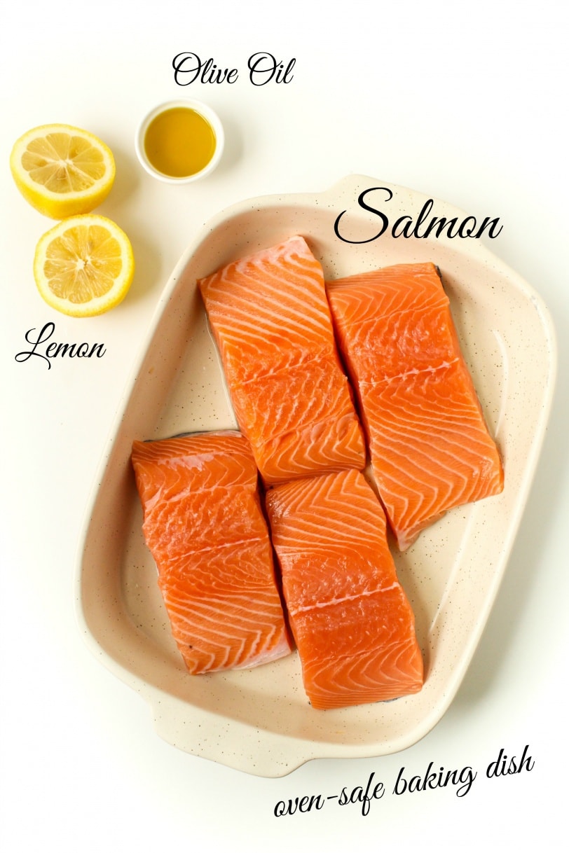 This recipe literally has three ingredients: salmon + olive oil + lemon juice, and everything is done in the same pan – the marinade AND the baking.