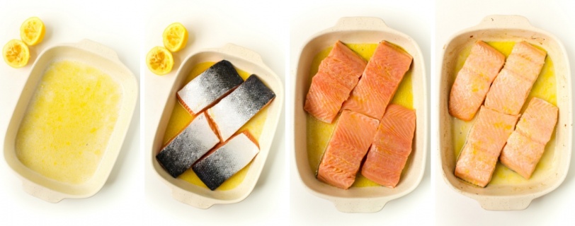 In a deep oven-safe baking dish, place a hefty drizzle of olive oil (about 1 tablespoon) + the juice from 1 to 2 lemons (about 3 to 4 tablespoons). Swirl it together a bit, then place your salmon into the dish, skin side up.
