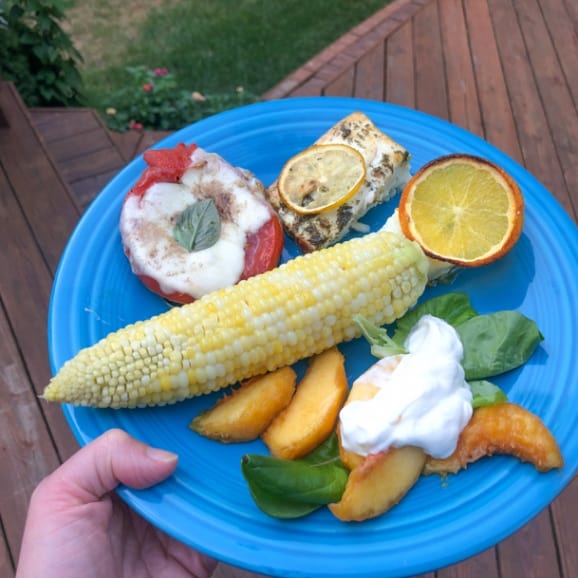 Served with buttery delicious farmers’ market corn, peaches and yogurt, and a yummy eggplant, pesto, tomato, and mozzarella stack topped with a little balsamic and basil. The eggplant/tomato stacks were briefly baked so the cheese melted and they were incredibly delicious! I don’t normally love eggplant but I really loved those.