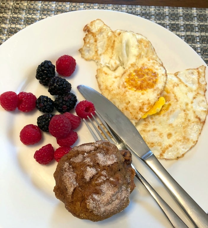 Yep, still obsessed with fried eggs with runny yolks now that I’m not pregnant anymore! This morning’s breakfast was two fried eggs with berries and a muffin. Such a yummy and satisfying combo (and yes, that’s sugar sprinkled on the muffin – gotta live a little my friends)!