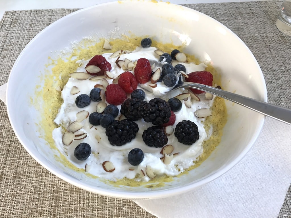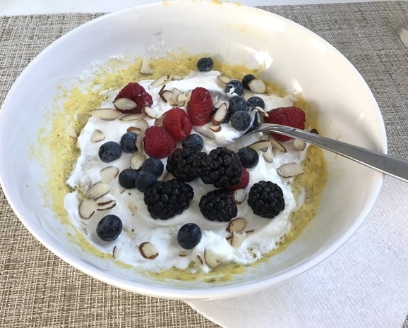 On the breakfast front this week, I’ve been having my two standard favorites – microwave banana oatmeal (topped with cottage cheese and berries) and my flour free breakfast pancake (microwave version), topped with yogurt, berries, and some slivered almonds for extra staying power.