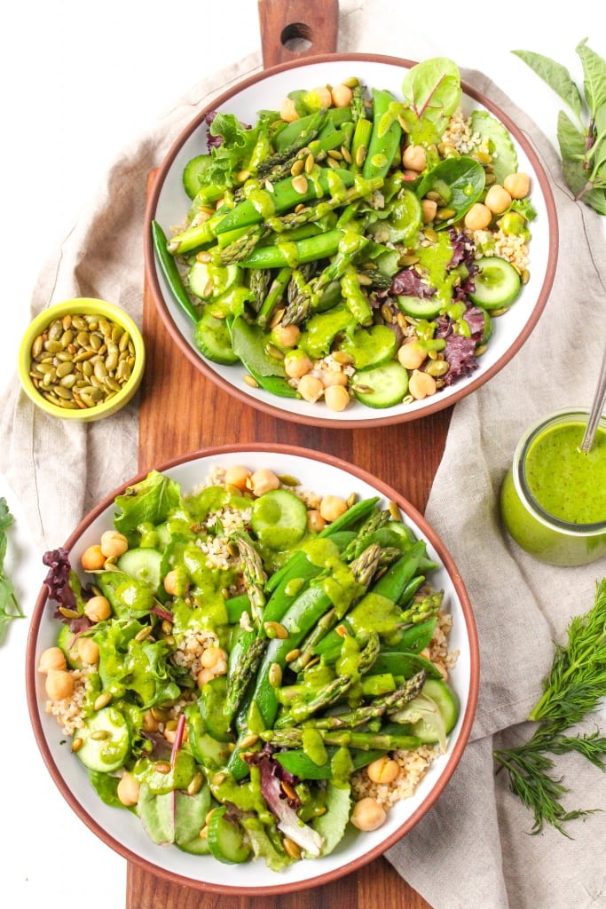 As for the rest of the salad, it’s packed with bright asparagus, sugar snap peas, cucumbers, and greens, and adorned with some bulgur, chickpeas, and toasted pumpkin seeds.