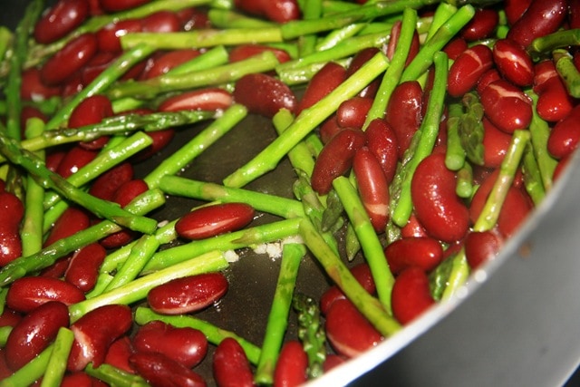 Easiest thing ever, and so tasty! Easily customizable, too. I just sautéed together some asparagus (you could use any veggies — zucchini, squash, string beans, etc.!) and kidney beans (use any beans you like) with garlic and a drizzle of olive oil.