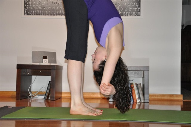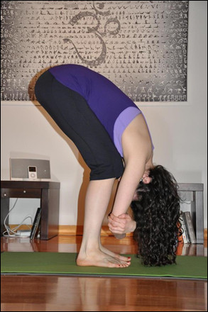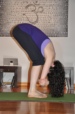 · Exhale, fold forward. If you can straighten your legs in this pose, grasp each elbow with the opposite hand. If you can’t straighten your legs or need more support, place your hands on a yoga block (or even a chair, if you prefer).