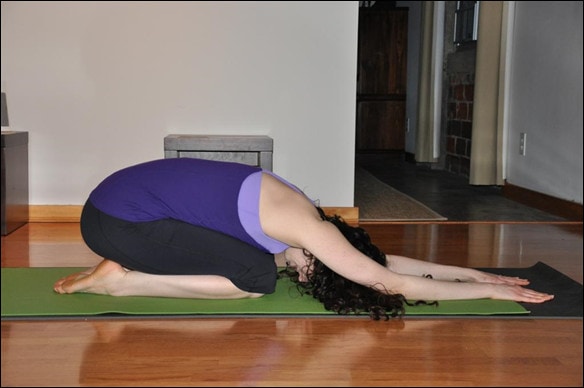 · From hand and knees, start to lower to the floor, shifting hips back and extending arms out in front of you. Your belly will rest on or between your thighs, and your forehead will reach towards the mat. (Place a towel under your forehead if it won’t reach the floor.