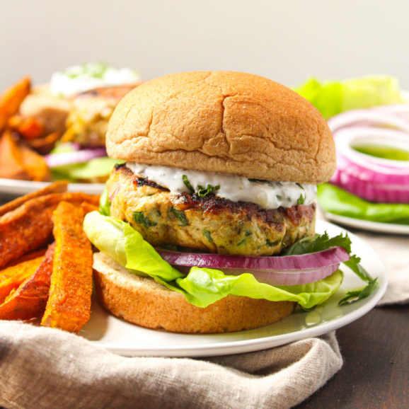 These curry turkey burgers with mint yogurt sauce are super easy and ridiculously tasty. Serve with sweet potato fries for a crave-worthy weeknight meal!