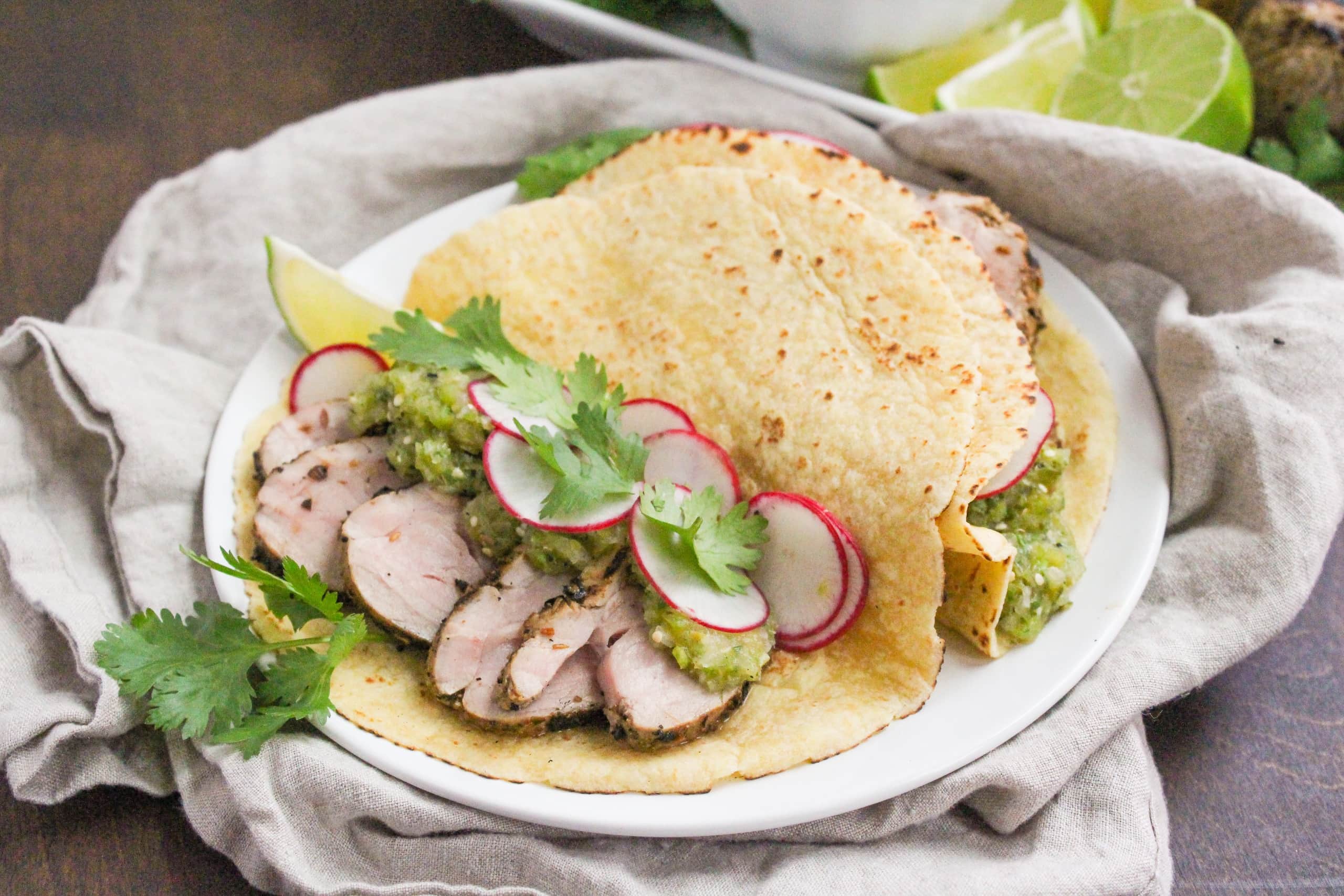 Grill up some pork tenderloin for these tasty tacos! Top with homemade salsa verde (recipe included), sliced radishes, cilantro, and/or your favorite taco toppings.