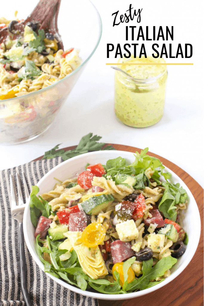 It’s packed with veggies like bell peppers, cherry tomatoes, and peppery arugula, and tossed in a creamy and zesty Italian dressing. You can keep it vegetarian, or add salami or pepperoni – up to you!