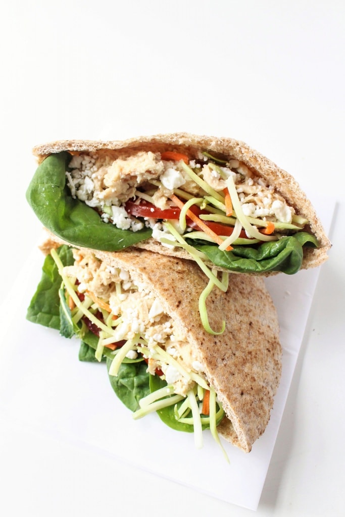 (whole wheat pita + Greek yogurt & dijon mustard mixed with tuna + spinach, broccoli slaw & tomato + canned tuna + feta cheese. Guacamole or hummus are also great mixed with tuna if you’d rather!)