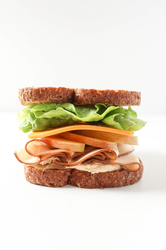 (whole wheat bread + hummus + lettuce + sliced turkey + apple slices & cheddar cheese. Or try gouda to mix it up!)