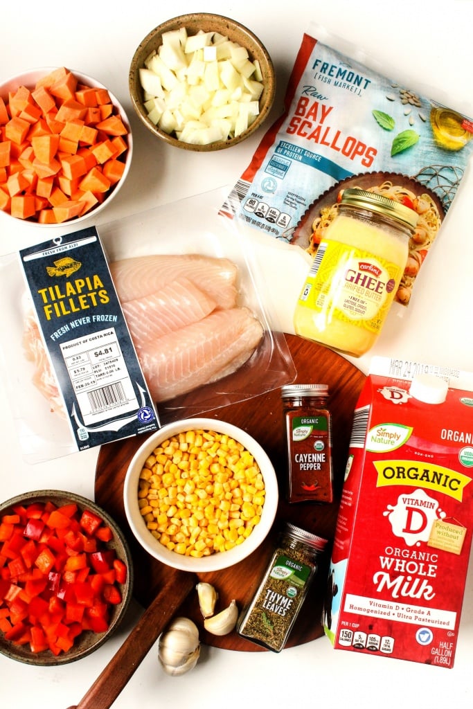 This homemade sweet potato chowder features tilapia and scallops, but feel free to use your favorite fish or seafood, like salmon, shrimp, or clams.