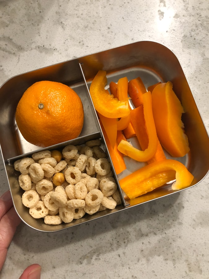 A clementine (she likes peeling them herself!) + sliced bell pepper + Power O’s cereal + dried chickpeas (I forget which brand this was, but lots of grocery stores have them in the same aisle as the nuts/seeds):
