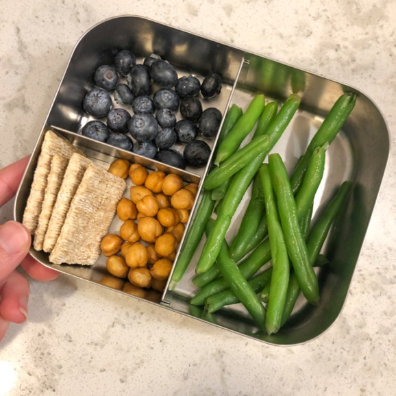 Cheese + string beans + carrots + blueberries + popcorn (<- love BjornQorn brand because it’s super yummy and also it has nutritional yeast on it for an extra protein boost – you could also just make a big batch of popcorn and add your own nutritional yeast, you do you). Also, FYI that popcorn is a choking hazard for younger toddlers. Official age recommendation for popcorn is age 4+.