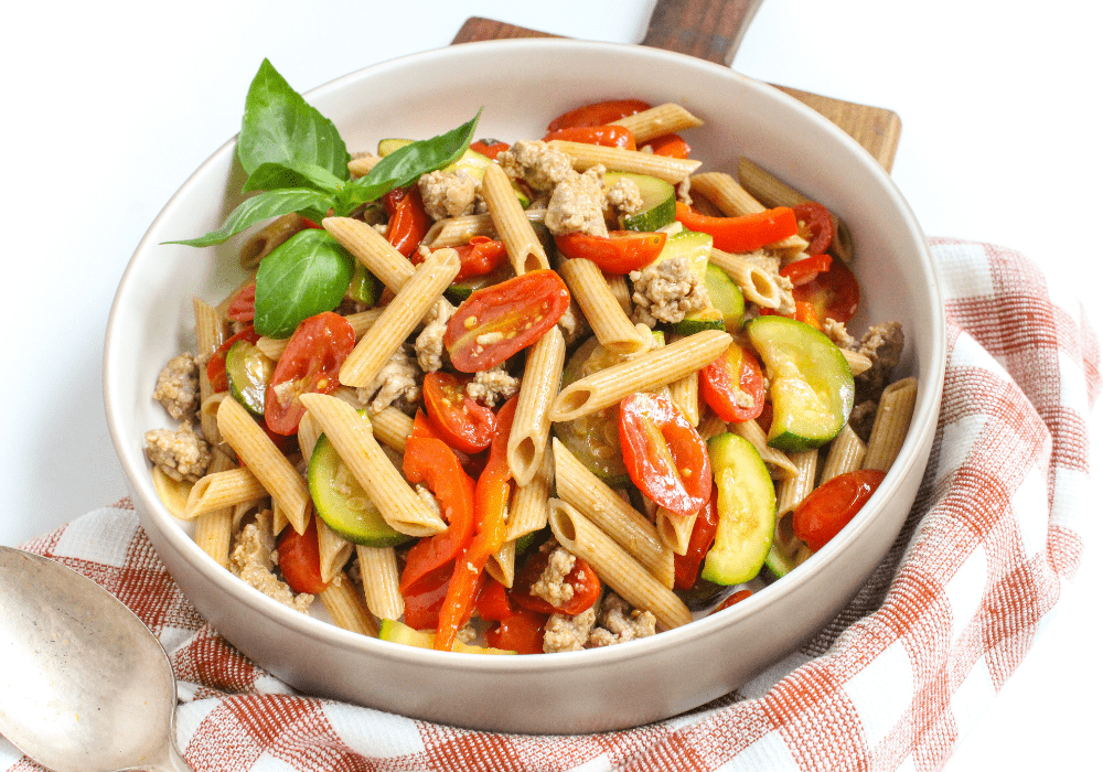 This summery pasta is a favorite of mine, with ground turkey, cherry tomatoes, bell peppers, and zucchini! It’s all tossed in a simple homemade tomato garlic sauce.