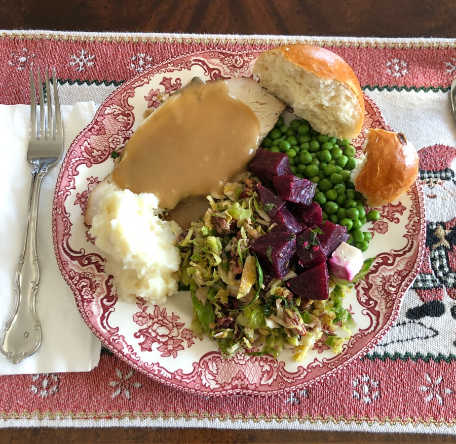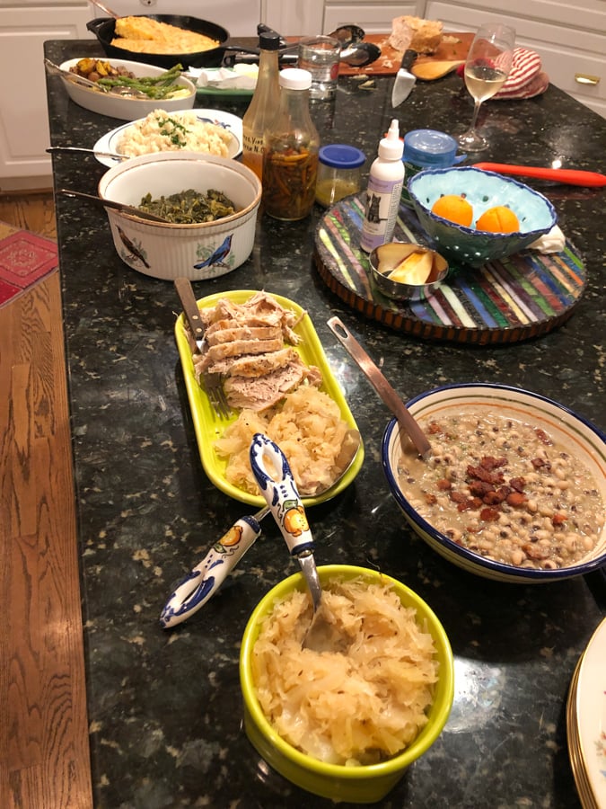 On New Years day, my father in law made us a feast! Pork, potatoes, collard greens, sauerkraut, black eyed peas (for luck in the new year!), string beans, and cornbread.