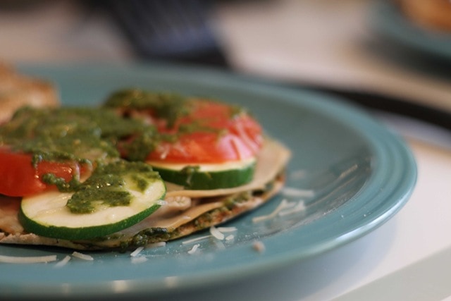 I made us whole wheat pita sandwiches topped with turkey, sliced zucchini and tomato, grated parmesan, spinach (added on later) and the special ingredient: my homemade spinach basil pesto! Check out the gorgeous pictures I took on his camera: